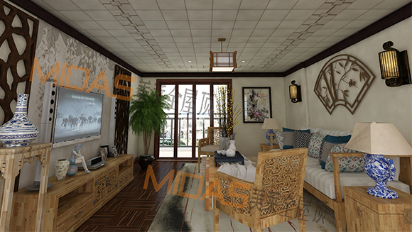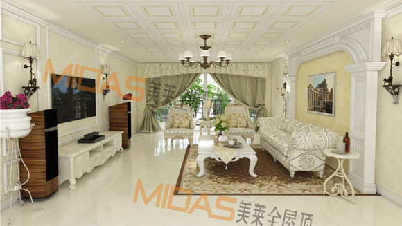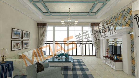 MIDAS美莱地中海风格客厅吊顶,主色调采用蓝色和黄色,辅以金黄色边框,一扫沉闷,给人以明快之感。